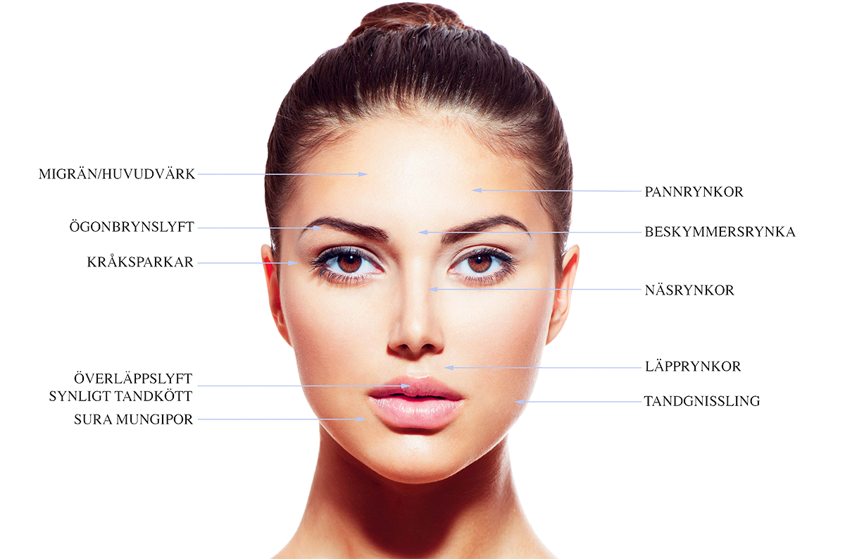Vissa muskler drar dessutom ner ögonbrynet och genom en behandling med Botox kan dessa muskler slappna av vilket ger en öppnare och piggare blick. Det är också möjligt att behandla nerdragna mungipor och vissa rynkor på halsen. Effekten kommer inom en till fjorton dagar och kvarstår mellan 3 till 6 månader.
